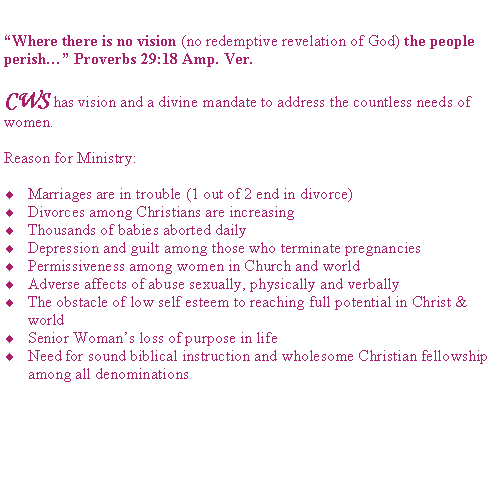 Biography | Need for Ministry | Coming Events | CWS Bookstore | CWS Book Order FORM | Conference Registration